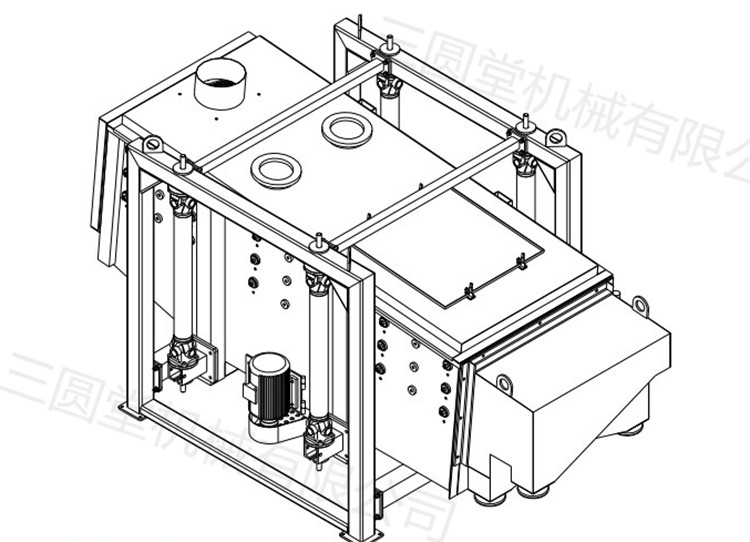b、振動電機安裝在方形搖擺篩體的下部,有效地保證了材料的緊湊結構,下部采用彈簧減振,使整機處于穩定狀態。